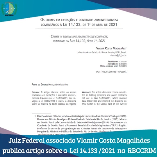 A Ajuferjes parabeniza o juiz associado Vlamir Costa Magalhães pela publicação do artigo “Os crimes em licitações e contratos administrativos: comentários à Lei 14.133, de 1º de abril de 2021” na mais recente edição da Revista Brasileira de Ciências Criminais (v. 206 n. 206 (2025): RBCCRIM – Janeiro/Fevereiro).