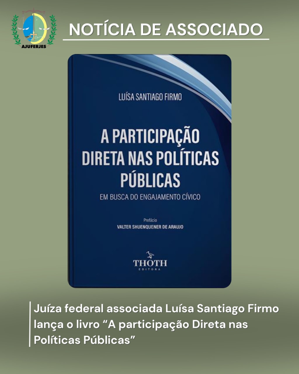 A juíza federal associada Luísa Santiago Firmo lançará o livro “A participação Direta nas Políticas Públicas” no dia 18/09, às 18h, no Gabinete de Leitura Guilherme Araújo, localizado à Rua Redentor, 157 – Ipanema, Rio de Janeiro – RJ.