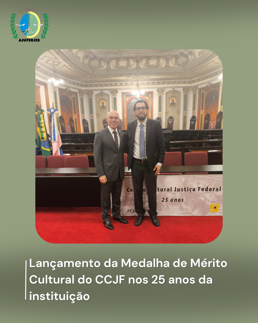Nesta quinta-feira, dia 09 de abril, ocorreu a cerimônia de comemoração dos 25 anos do Centro Cultural da Justiça Federal. A Ajuferjes se fez presente, na pessoa do seu Diretor Cultural, Rafael Rihan, que levou os cumprimentos da Presidente Marceli Siqueira ao Desembargador Theophilo Miguel, Diretor-Geral do CCJF.